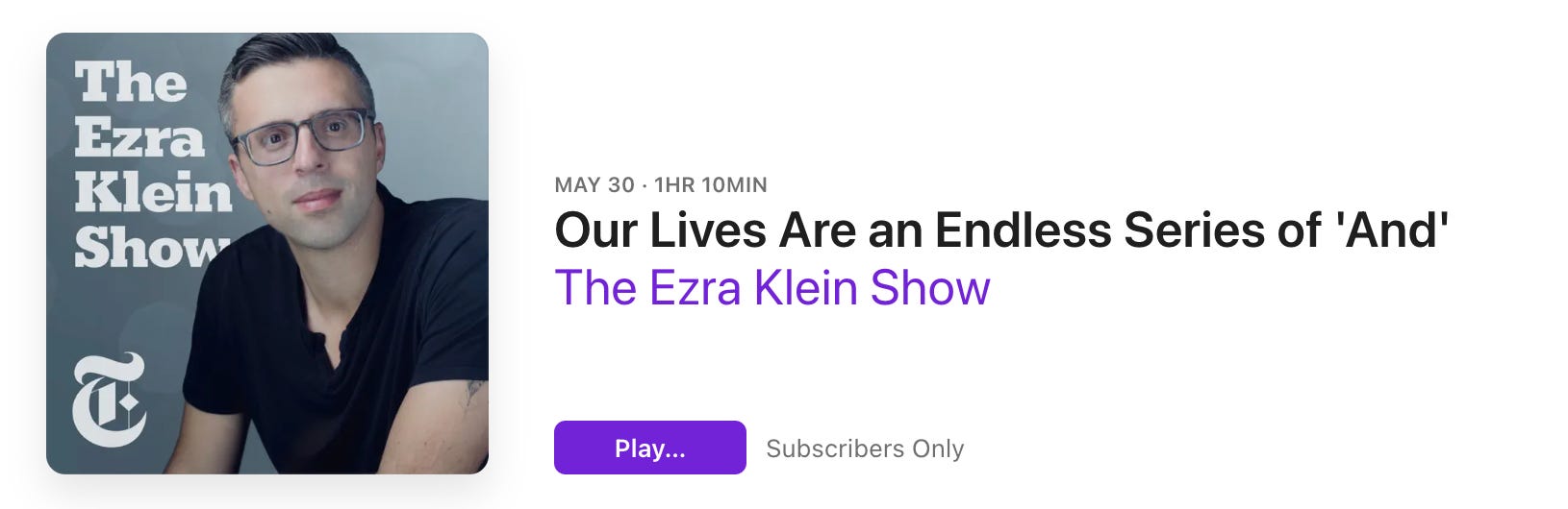 These days I often find myself thinking about all of the terrible things going on in the world, some far away and some in my own community. And then I go home to make dinner for my family or notice that suddenly everything is in bloom or remember that my driver’s license is about to expire. It’s difficult to hold both the difficult and often heartbreaking realities of the world around us with the mundane and beautiful details of everyday life. In “Our Lives Are an Endless Series of ‘And,’” Ezra Klein’s explores this challenge during his interview with Kathryn Schulz, author of the memoir Lost and Found. While they don’t come to any easy answers, I enjoyed their conversation and it made me feel a little less alone when grappling with this reality.